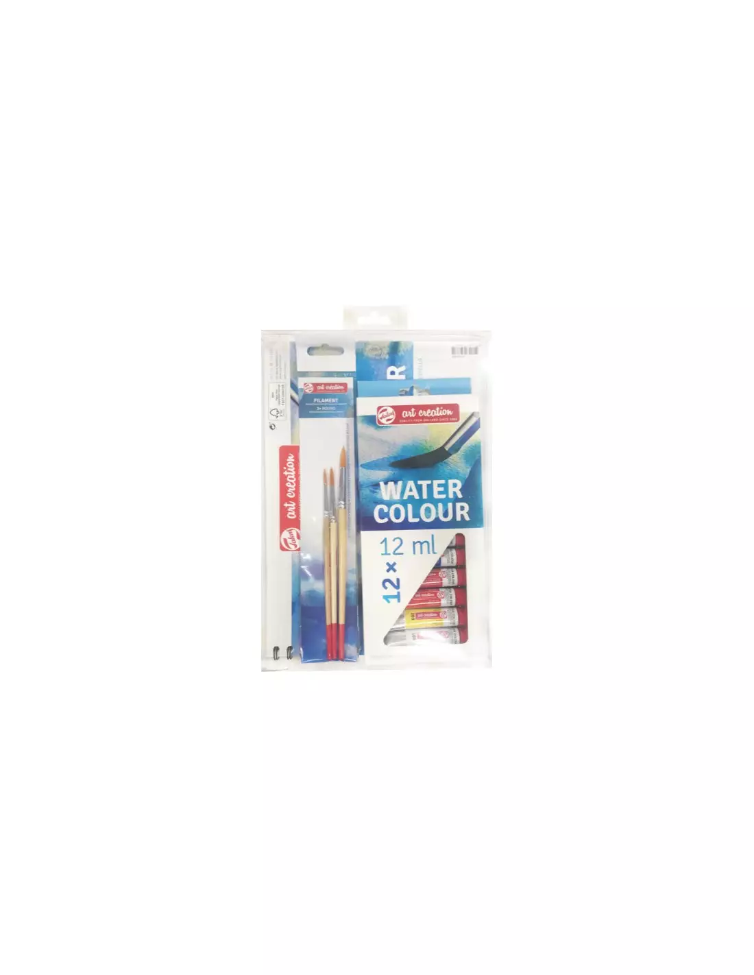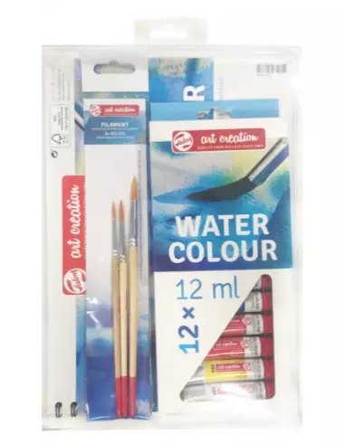 Este set incluye todo lo necesario para iniciarte en el mundo de la acuarela. Se compone de un bloc de 15 hojas A4 de 290gr, 3 pinceles de diferentes grosores, 12 tubos de 12ml en colores vivos y un pequeño libro paso a paso.