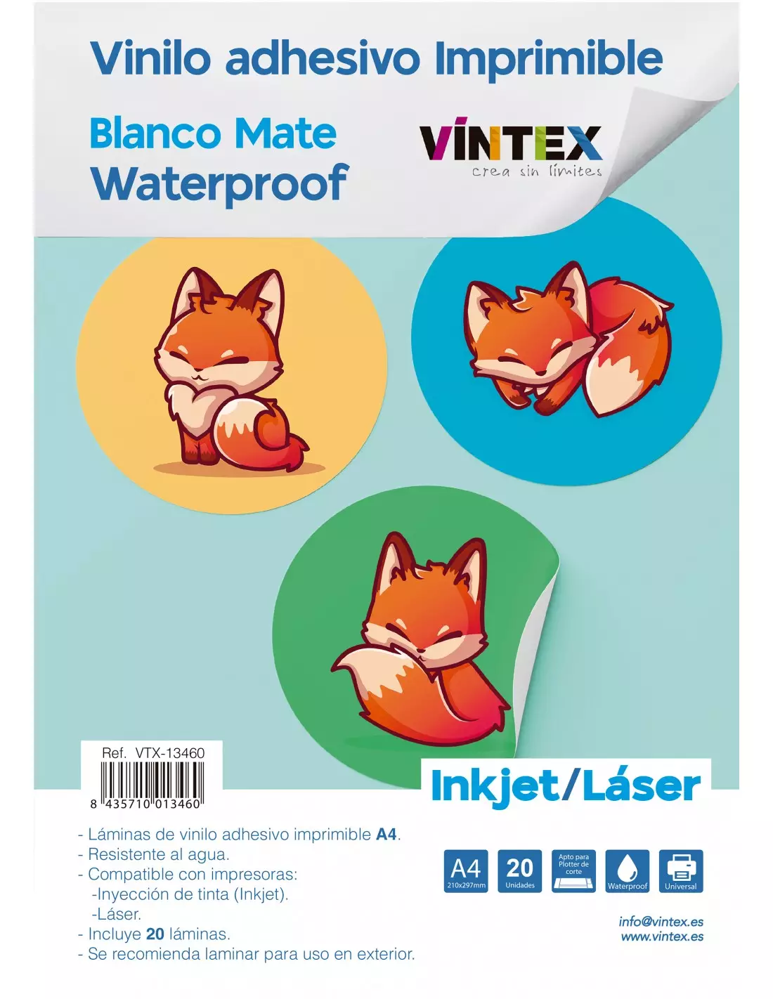 Vinilo imprimible adhesivo blanco brillo premium. Para impresora de tinta.Formato A4. No es resistente al agua.Varios packs disponibles: 6, 20, 50 hojas. Para imprimirlo es necesario utilizar configuración de papel con mayor grosor. ¿Lo prefieres en MATE?. Y si necesitas más cantidad a mejor precio echa un vistazo al formato profesional