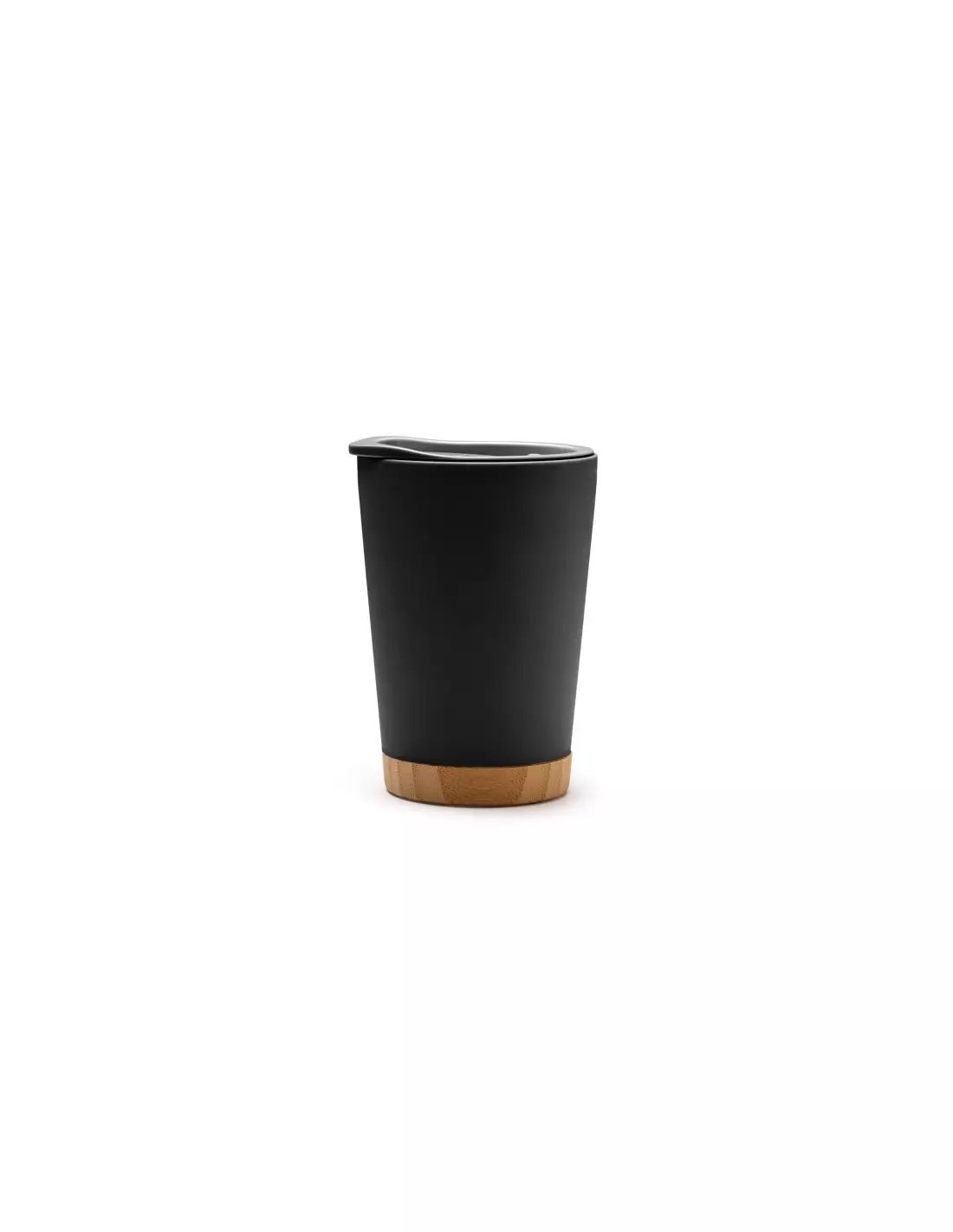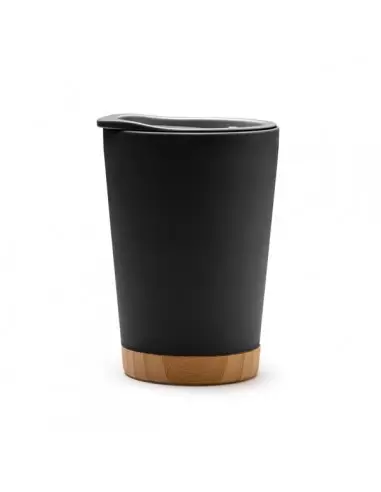 Vaso con cuerpo de PP reciclado de doble pared y base de bambú. Incluye tapa dosificadora. Capacidad de 290 ml.
