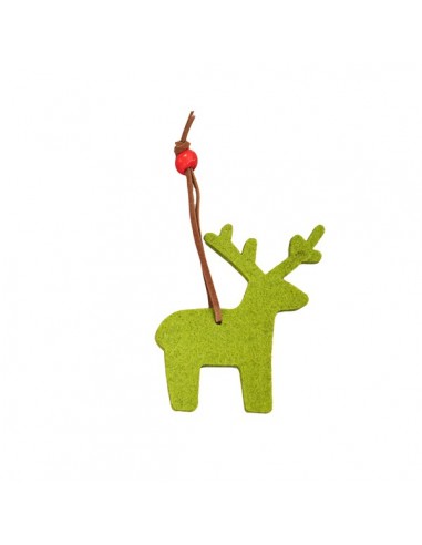 Adorno navideño de fieltro. Disponible en tres diseños: copo de nieve, árbol y reno. Todos los diseños se presentan con cordel marrón y cuenta roja en su extremo.