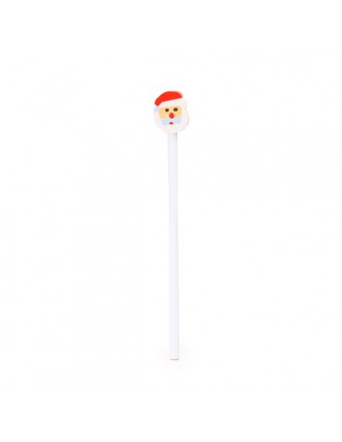 Lápiz de madera blanco y redondo con goma disponible en tres diseños navideños: árbol, Papá Noel y muñeco de nieve.