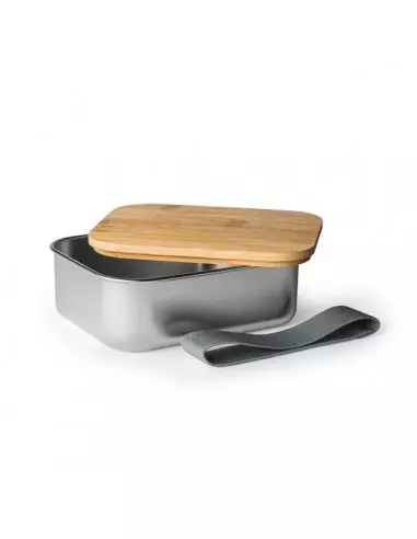 Fiambrera de acero inoxidable 304 con tapa de bambú y banda de seguridad en poliéster. Capacidad de 750 ml. Idónea para personalizarla y promocionar tu empresa.