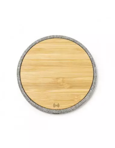 Cargador inalámbrico con cuerpo elaborado en tejido RPET y superficie de carga en bambú.
