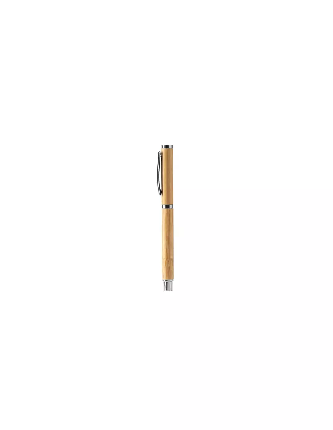 Bolígrafo tipo roller con cuerpo de bambú y detalles metalizados. Carga jumbo de tinta azul.