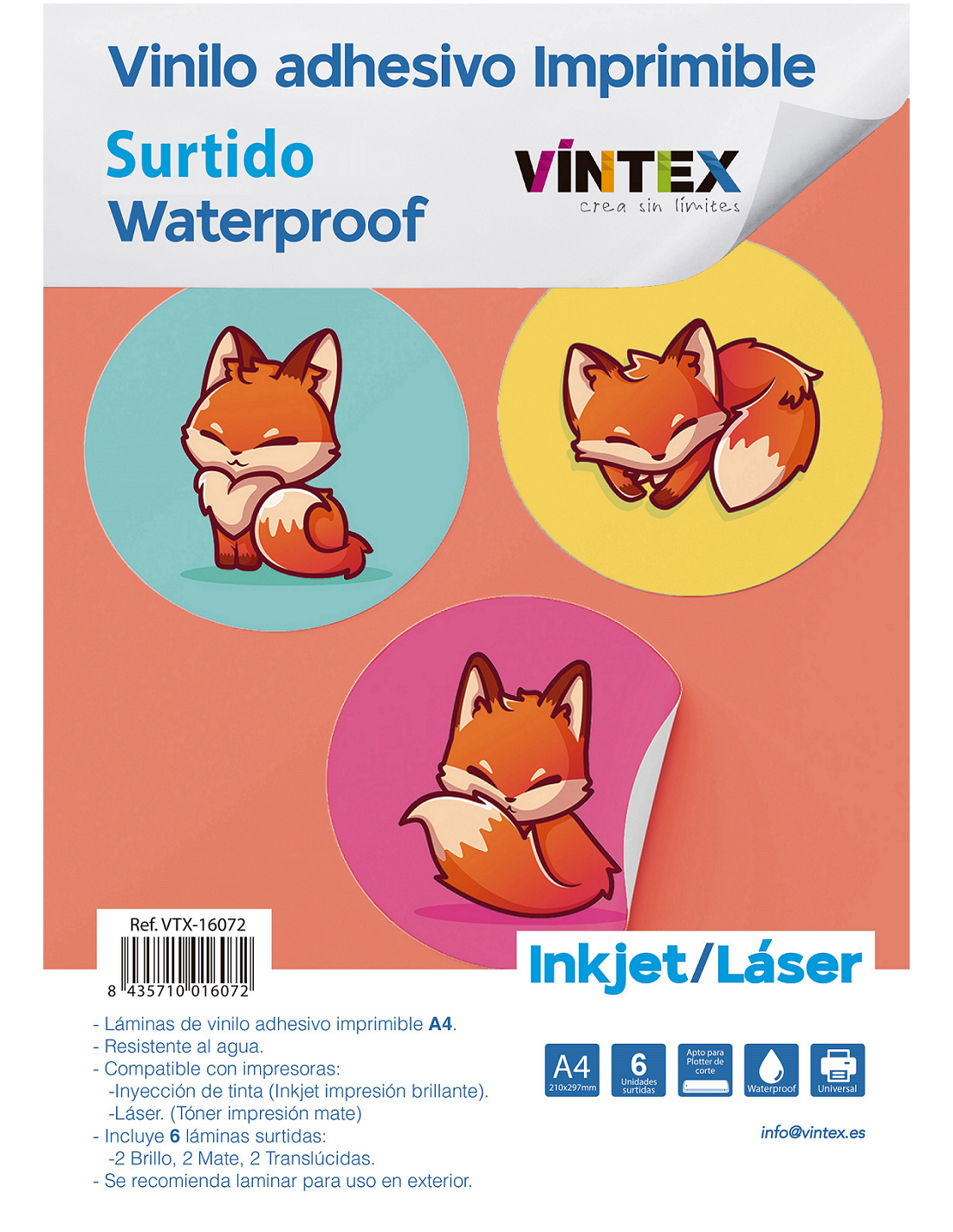 Nuevo vinilo imprimible adhesivo blanco mate. Compatible con impresoras domésticas tanto de chorro de tinta (inkjet) como láser. Es Waterproof (resistente al agua). Ideal para realizar tus etiquetas o pegatinas en interior. Para su uso en exterior se recomienda laminar. ¿Has probado las láminas adhesivas de Vintex. Formato A4. Incluye 20 unidades. Y si...