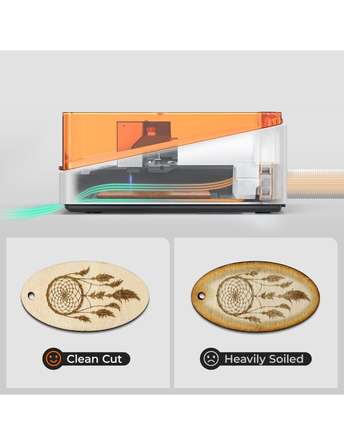 20 W: Diseñado para grabado profundo y corte limpio , con un punto de 0,15 x 0,15 mm, lo suficientemente potente para cortar materiales más gruesos manteniendo resultados estables.