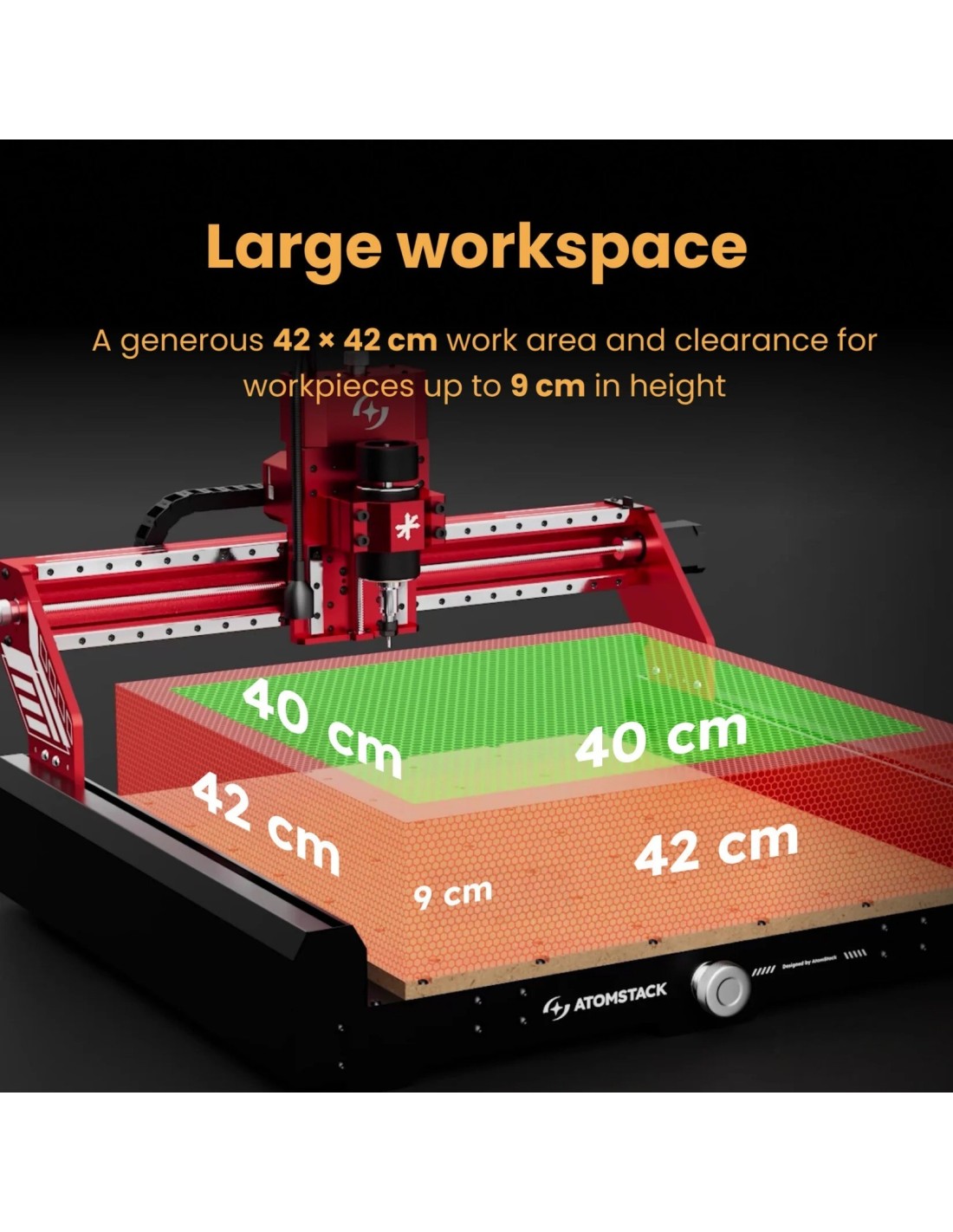 - Amplio espacio de trabajo: Una generosa mesa de trabajo de 42 × 42 cm y una altura de trabajo de hasta 9 cm te dan espacio para piezas más grandes y proyectos complejos, todo ello manteniendo la máquina en un tamaño manejable para cualquier taller.