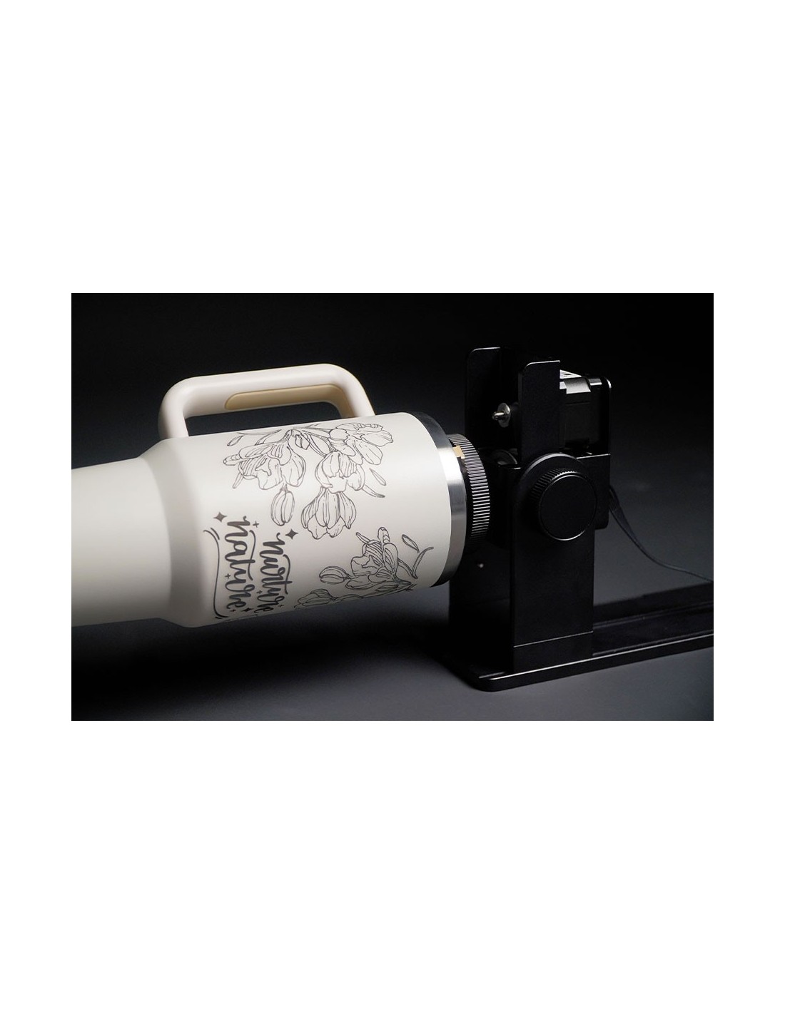 Promark MOPA es compatible con los sistemas rotatorios Chuck y Roller de FLUX, lo que permite un grabado preciso en objetos cilíndricos grandes, como vasos Stanley de 40 oz.