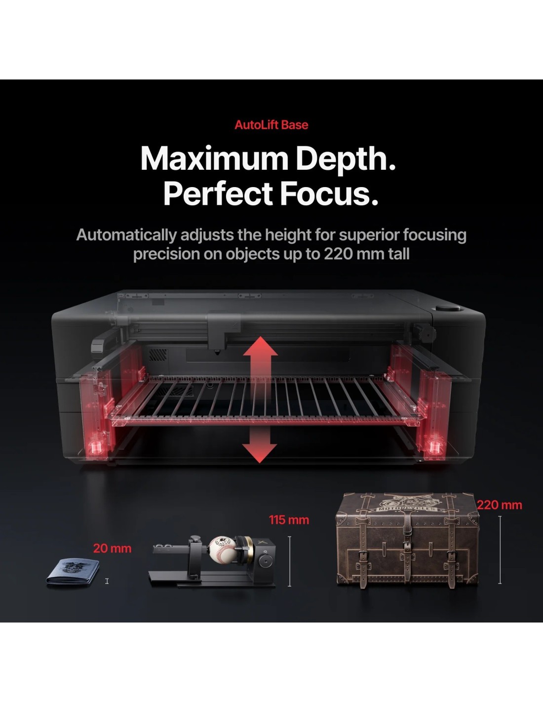- Base AutoLift: Máxima profundidad. Enfoque sin esfuerzo: Olvídate de los ajustes manuales. Domina objetos de hasta 21,5 cm de altura. Guiada por LiDAR, la Base AutoLift posiciona automáticamente el material a la altura óptima, ofreciendo un enfoque impecable y sin esfuerzo.