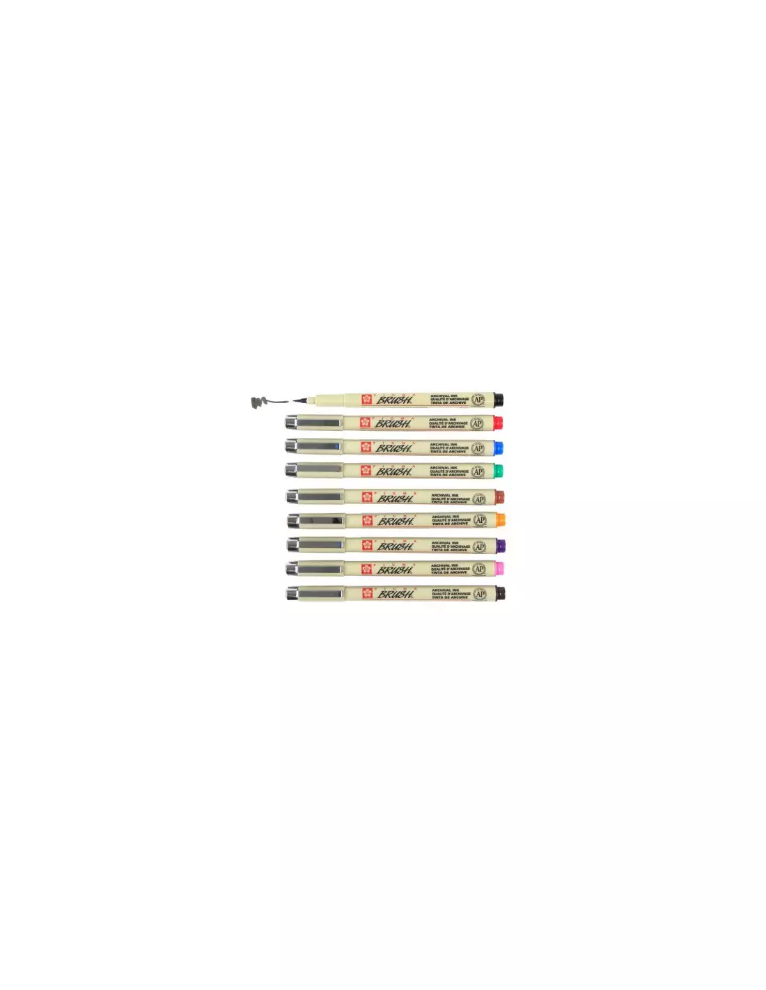 Incluye 9 plumas, 8 del tamaño "005" (0,20 mm) + 1 pluma del tamaño "05" (0,45 mm) de color negro. Incluye: Naranja, Rosa , Verde, Rojo, Azul (1 ud. del 005), Púrpura, Marrón, Negro (todos 005 y una unidad de Negro del 05.