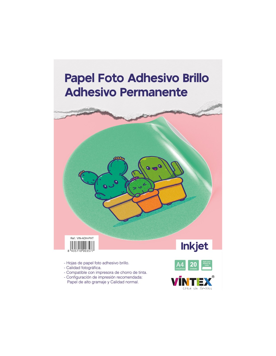Papel Adhesivo acabado brillante para impresora doméstica Inkjet (inyección de tinta) en formato A4. Paquete 20 hojas. Adhesivo permanente. Gramaje del papel: 135 grms. Calidad: Fotografía. ¿Necesitas nñas cantidad? Echa un vistazo al pack de 50 hojas ¿Tienes una impresora LÁSER? Ahora también podrás hacer tus pegatinas de papel con el Papel de pegatina satinado Láser/Inkjet